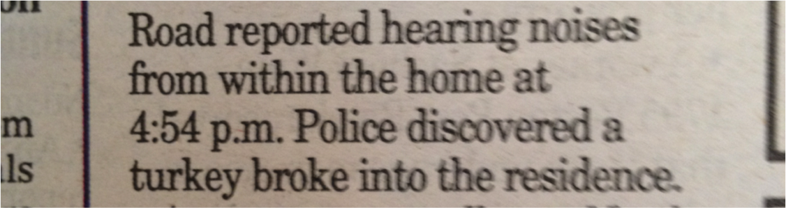How can this turkey get a fair trial now? How can the turkey explain that he wandered in accidentally because the back door was left open, and well, he’s a fucking turkey. A literal bird brain. No. Now he’s branded a criminal. The big old Breaking and Entering. B&E. Without even a jury of his peers. Granted, he had a TV and $1,200 worth of jewelry tucked into his waddle….